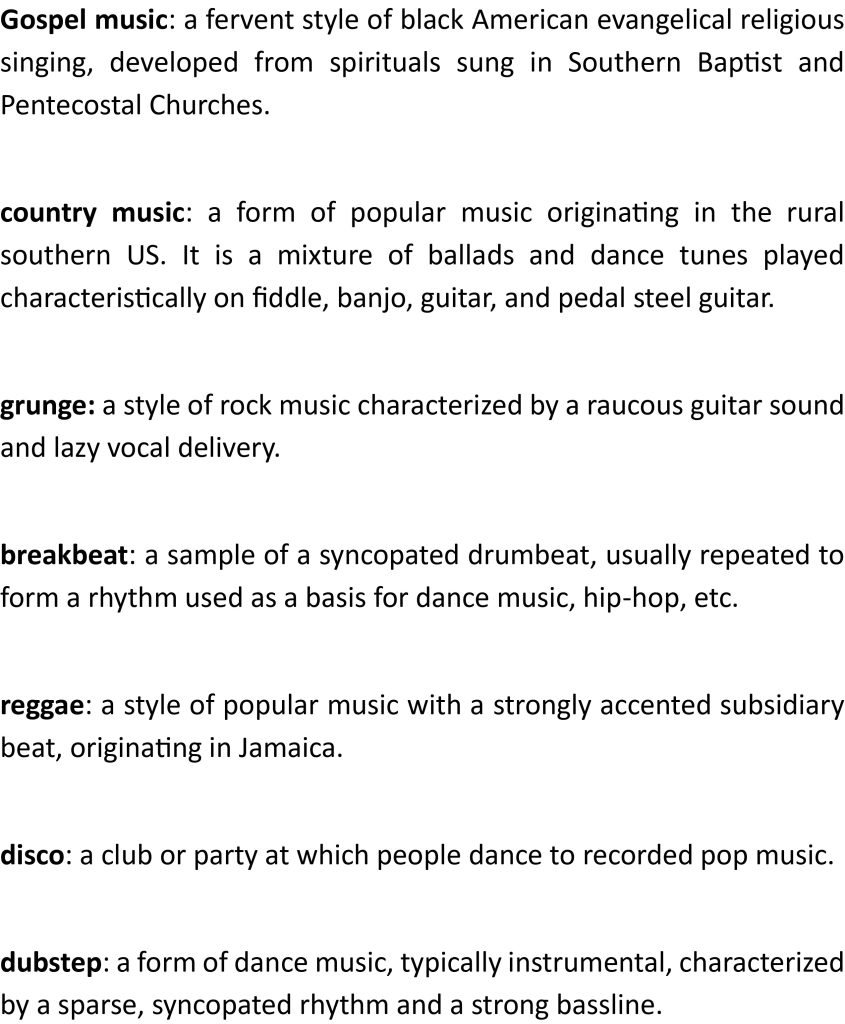 - Music genres, instruments, and terminology are also discussed in the vocabulary and grammar sections.