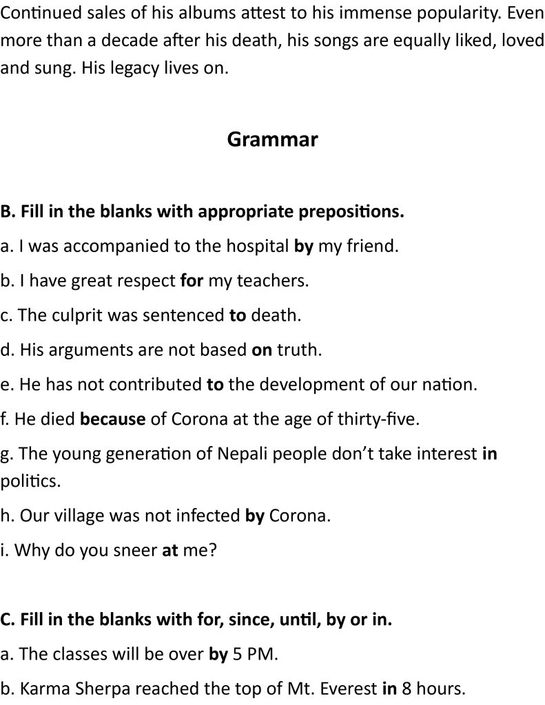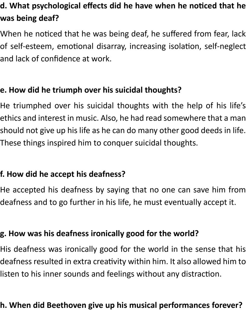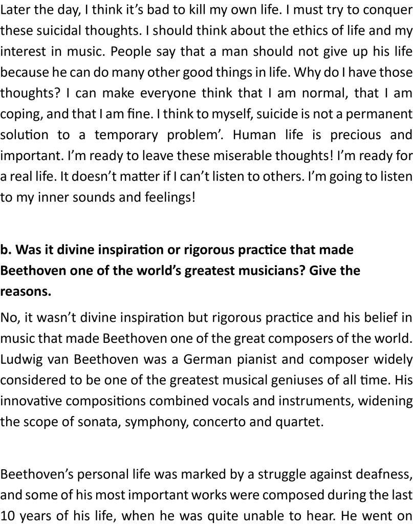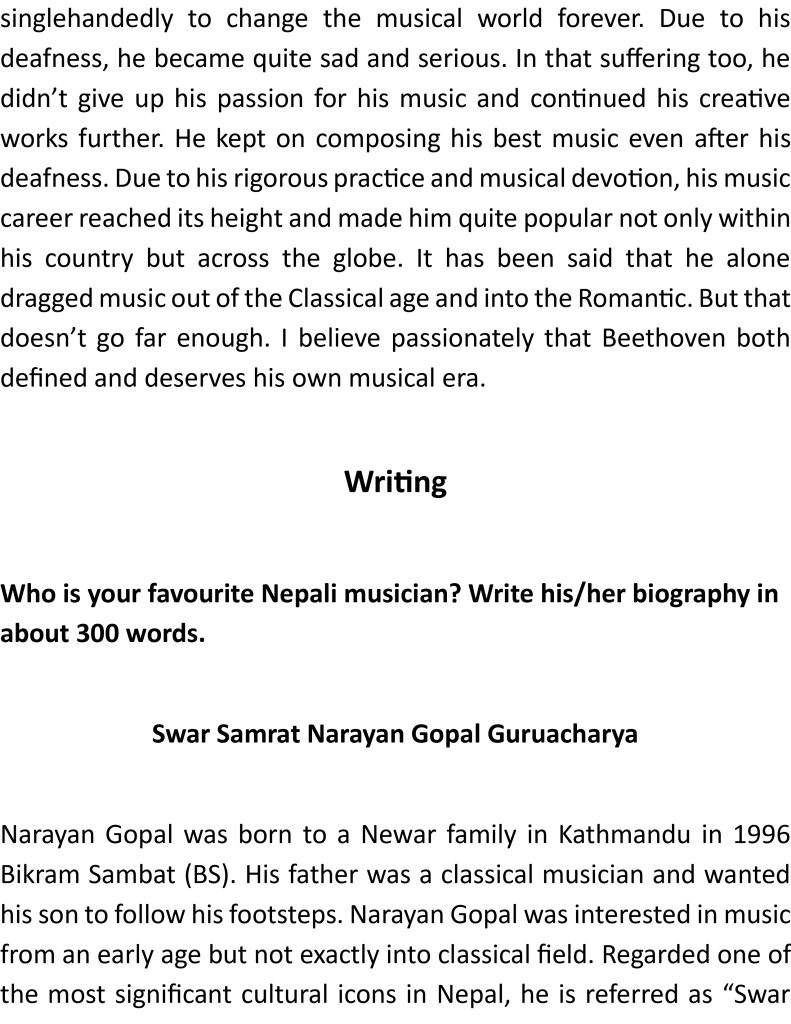 The writing and grammar sections encourage students to apply their learning by writing a biography of a Nepali musician and practicing correct prepositions. Overall, the lesson inspires students to look beyond limitations and embrace creativity and discipline. Beethoven’s story becomes a timeless reminder that true art often emerges from personal struggle and perseverance.